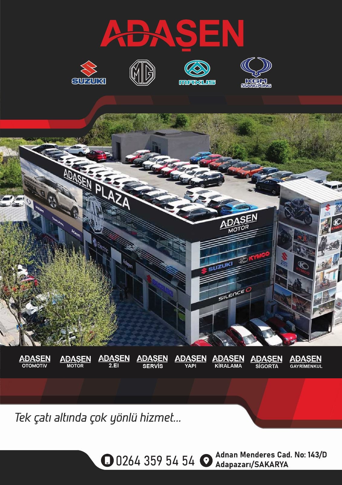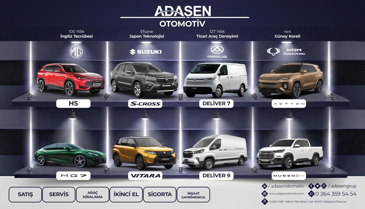 Sakarya – Batı Karadeniz bölge bayisi olarak faaliyet gösteren Adaşen Otomotiv, hibrit segmentindeki bu hamlesiyle bölgesel pazardaki iddiasını artırmayı hedefliyor. Yeni modeller, lansman dönemine özel avantajlarla haftanın 7 günü Adnan Menderes Caddesi’ndeki ADAŞEN PLAZA’da ziyaretçilerini bekliyor. Adaşen Otomotiv; MG’nin yanı sıra efsane Japon markası Suzuki, 127 yıllık İngiltere markası Maxus ve 4x4 uzmanı Güney Koreli KGM SsangYong markalarına da hizmet veriyor. Adaşen Grup bünyesinde ayrıca araç kiralama, ikinci el satış, tüm markalara servis hizmeti, sigortacılık, inşaat ve gayrimenkul alanlarında da faaliyetler sürdürülüyor. Detaylı bilgi için: www.adasen.com.tr