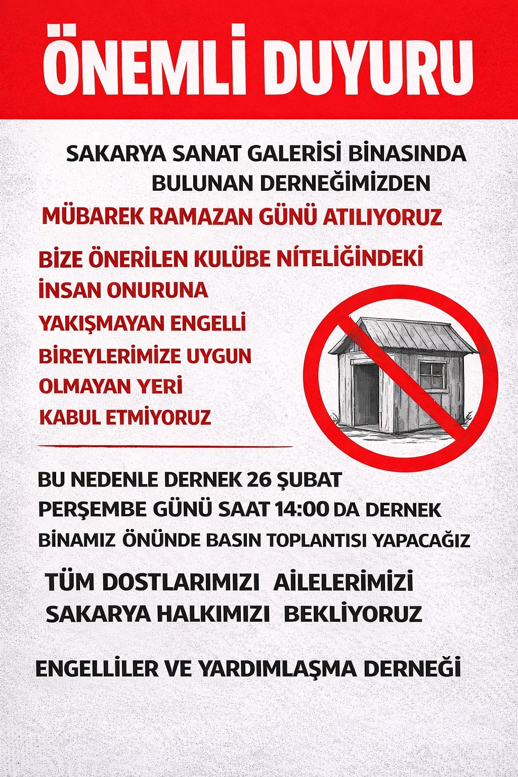 26 Şubat Perşembe günü saat 14.00’te, sanat galerisinin altında bulunan dernek binasında gerçekleştirilecek toplantıda, yaşanan süreçle ilgili kamuoyuna detaylı açıklamalarda bulunulacak. Başkan Aslı Çam, alınan kararın engelli bireyler ve aileleri açısından doğuracağı sonuçlara dikkat çekerek, destek çağrısında bulunacak.