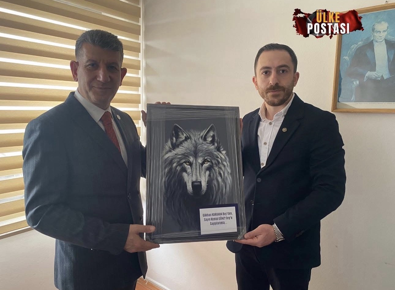 Samimi bir atmosferde gerçekleşen görüşmede, kurumlar arası iş birliği ve teknik çalışmalar üzerine fikir alışverişi yapılırken, ziyaretin en dikkat çekici anı ise takdim edilen özel hediye oldu. Karahan, realist üslubuyla tanınan ressam Süheyla Üstek’in çiziminden esinlenerek hazırlanan “Bozkurt” eserini Kemal Güney’e sundu.